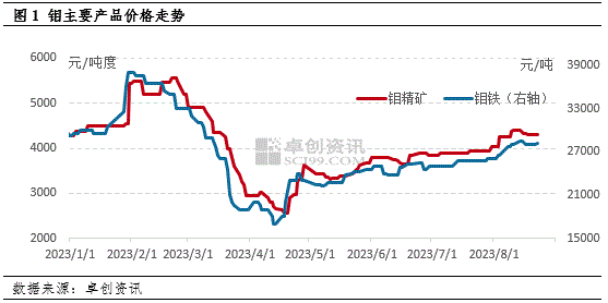 从图中可看出2023年开年,随着国际钼价的持续拉涨,以及国内钼原料竞标价格的上涨,使得钼铁报价一路上行,钼铁高价达40万元/吨以上,而4月份开始,月初钼价经过持续下滑后有探涨意愿,但因下游需求原因,价格再次冲高受阻,5月份钼市恢复后,逐步高位运行,但涨跌幅度并不明显,进入8月,市场原料资源偏低,钢厂招标支撑下,月初有高位显现,随着需求逐步放缓,钼价冲高回落。