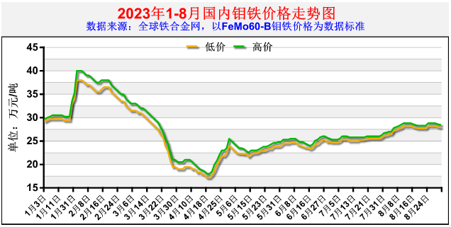 目前,市场价格还算稳定,其中部分常规品位钼精矿价格僵持在4300-4310元/吨度,行业内的观望及等待后续是为了主流的大型钼矿山出货及成交表现上;钼铁零售含税报价暂稳在27.9-28.4万元/吨,成交指导价格暂稳在27.8-28.3万元/吨;校友产业钢厂目前招标价格多在27.8-28.3万元/吨不等,各家钢厂根据采购时间点不一,环比上轮价格也是涨跌各异,钢招市场呈现量增价弱,之后的市场发展有待进一步明朗。