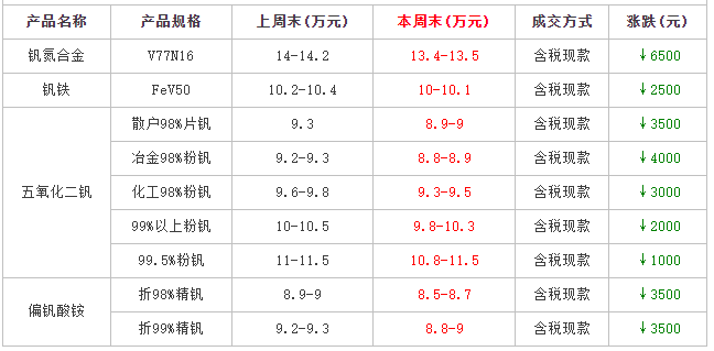 据全球铁合金网了解,截止目前,国内钒氮合金市场零售报价多不低于含税现款13.5万元/吨,实际成交僵持在现款13.4-13.5万元/吨左右,贸易商采购询盘压价至13.2-13.3万元/吨,但厂家多拒绝继续降价出货;钒铁市场弱稳僵持运行,其中50钒铁主流报价在含税现款10.2-10.3万元/吨左右,少数高价仍报10.5-10.6万元/吨,实际成交多在10-10.3万元/吨之间拉锯,低于10万元/吨仍不好采货。