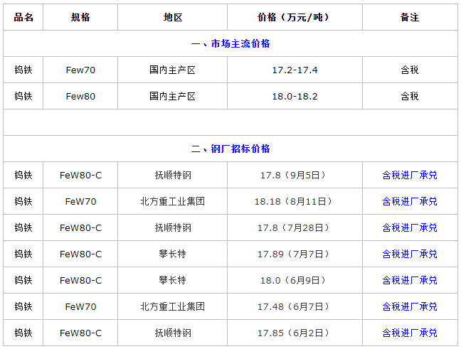 截至目前,国内65%黑钨精矿含税价格12.0-12.1元/吨,65%白钨精矿价格11.9-12.0万元/吨,60%黑钨精矿价格11.9-12.0万元/吨,60%白钨精矿价格11.8-11.9万元/吨,55%黑钨精矿价格11.8-11.9万元/吨,55%白钨精矿价格11.7-11.8万元/吨;APT价格17.95-18.05万元/吨;中颗粒碳化钨粉价格267-270元/公斤,钨粉价格271-274元/公斤;70#钨铁价格17.2-17.4万元/吨,80#钨铁价格18.0-18.2万元/吨;钨酸钠价格13.6-14.1万元/吨。