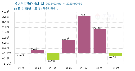 商品价格K柱图,运用价格走势K线的理念,以柱状图形式,反映每周或者每月的价格涨跌变化,投资者可以根据K柱图的变化,来进行买卖投资。红色表示:上涨;绿色表示:下跌;K柱高度表示:涨跌幅度,近期市场走势偏强,铅锭市场连续10周上涨,9月后市场整体小幅下调。