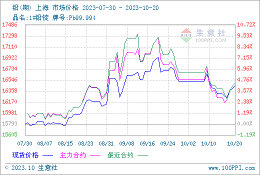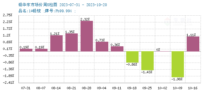 上周铅市(10.13-10.20)震荡上行,国内市场均价上周末在16300元/吨,本周初在16435元/吨,涨0.83%。