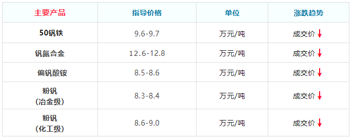 钒原料价格也继续震荡下行,其中片钒散货报价已下调至含税现款8.4-8.5万元/吨,实际成交下滑至现款8.3-8.4万元/吨,由于大厂报价有待消化,新单报价多继续看低;而粉钒市场无大改观,化工领域需求依旧较少,新增订单寥寥无几,其中化工级98%粉钒在含税现款8.6-9万元/吨之间,99%粉钒下滑至含税现款9-9.5万元/吨之间,99.5%粉钒多在含税现款10-11万元/吨之间。另外,偏钒酸铵市场继续承压偏弱运行,其中折98%偏钒酸铵进一步下压至含税现款8.2-8.3万元/吨左右,由于片钒价格不断下滑,冶金用户多继续压价,折99%偏钒酸铵在含税现款8.5-8.7万元/吨之间拉锯,但厂家仍多不愿出货,停产观望较多。