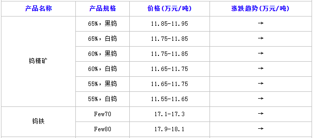 截至目前,国内65%黑钨精矿含税价格11.85-11.95元/吨,65%白钨精矿价格11.75-11.85万元/吨,60%黑钨精矿价格11.75-11.85万元/吨,60%白钨精矿价格11.65-11.75万元/吨,55%黑钨精矿价格11.65-11.75万元/吨,55%白钨精矿价格11.55-11.65万元/吨;APT价格17.7-17.8万元/吨;中颗粒碳化钨粉价格260-263元/公斤,钨粉价格264-267元/公斤;70#钨铁价格17.1-17.3万元/吨,80#钨铁价格17.9-18.1万元/吨;钨酸钠价格13.4-13.9万元/吨;相比昨日,除APT价格再度小幅下跌500元/吨之外,其他钨系产品价格弱势暂稳运行,产业链上下游心态分歧,供需僵持及博弈尚未消除,贸易商心态随行观望为主。